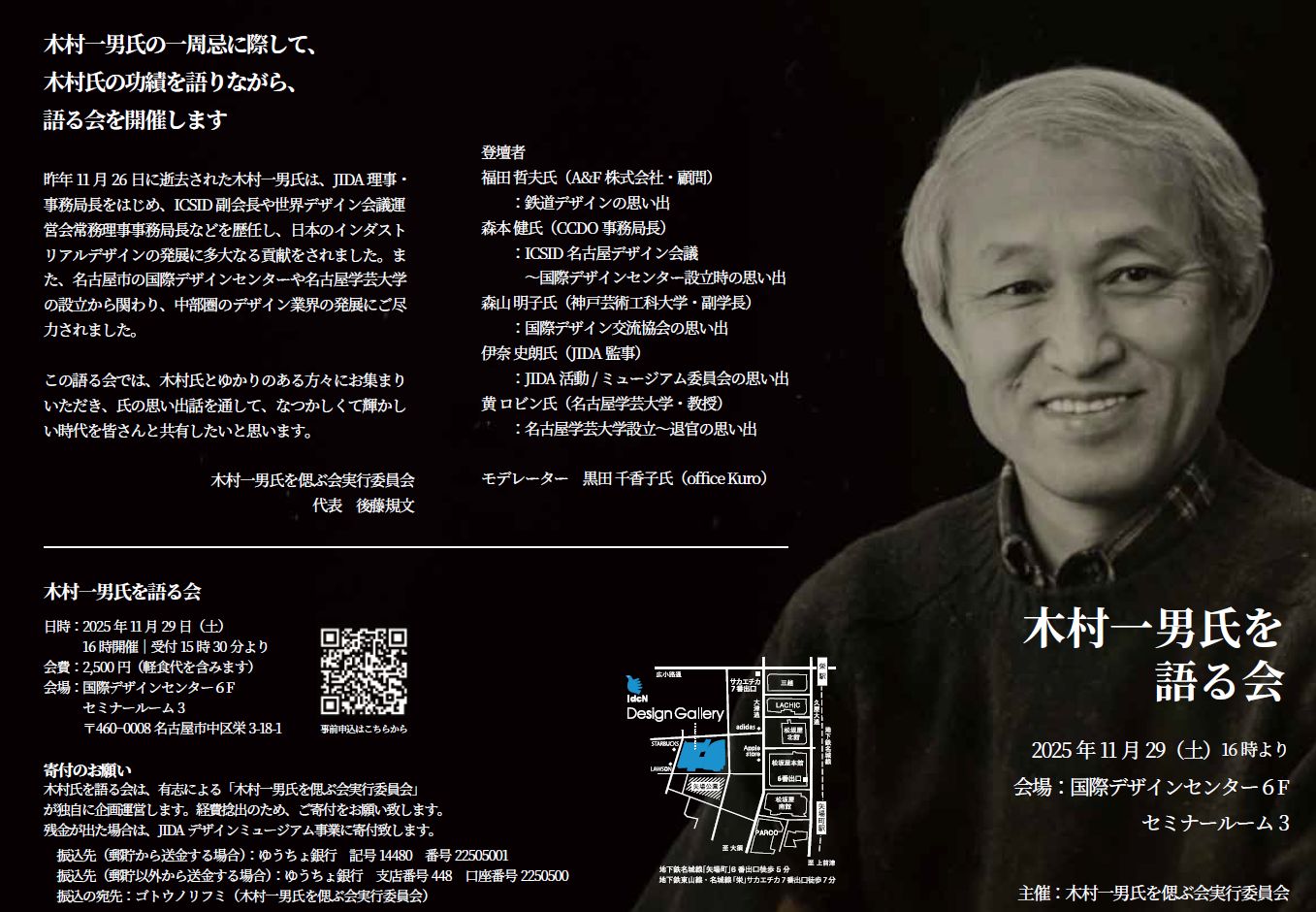 この展覧会では、木村氏が残した数多くの遺品や関連資料を展示します。東京藝術大学での学生時代、日産自動車でのデザイナー時代、氏が心より愛した鉄道デザインの世界、JIDAなどのデザイン団体での国際的な活動資料、世界デザイン会議ICSID’89 NAGOYA〜国際デザインセンター設立時や、名古屋学芸大学での教員時代の資料など。また木村氏がプライベートで描いていた年賀状スケッチなど、多くの展示物を通して、戦後のIDの足跡と、名古屋のデザイン業界が一丸となってやり遂げたイベントの裏側がご覧いただけます。