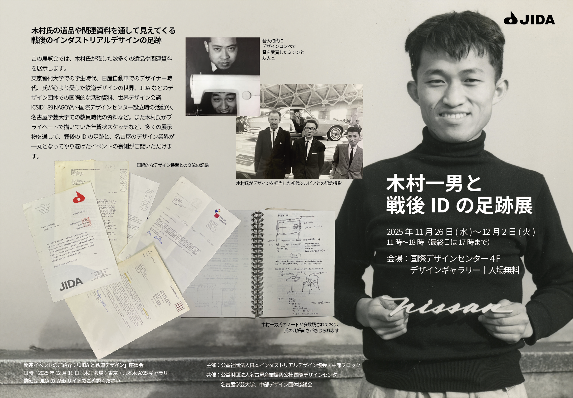 この展覧会では、木村氏が残した数多くの遺品や関連資料を展示します。東京藝術大学での学生時代、日産自動車でのデザイナー時代、氏が心より愛した鉄道デザインの世界、JIDAなどのデザイン団体での国際的な活動資料、世界デザイン会議ICSID’89 NAGOYA〜国際デザインセンター設立時や、名古屋学芸大学での教員時代の資料など。また木村氏がプライベートで描いていた年賀状スケッチなど、多くの展示物を通して、戦後のIDの足跡と、名古屋のデザイン業界が一丸となってやり遂げたイベントの裏側がご覧いただけます。