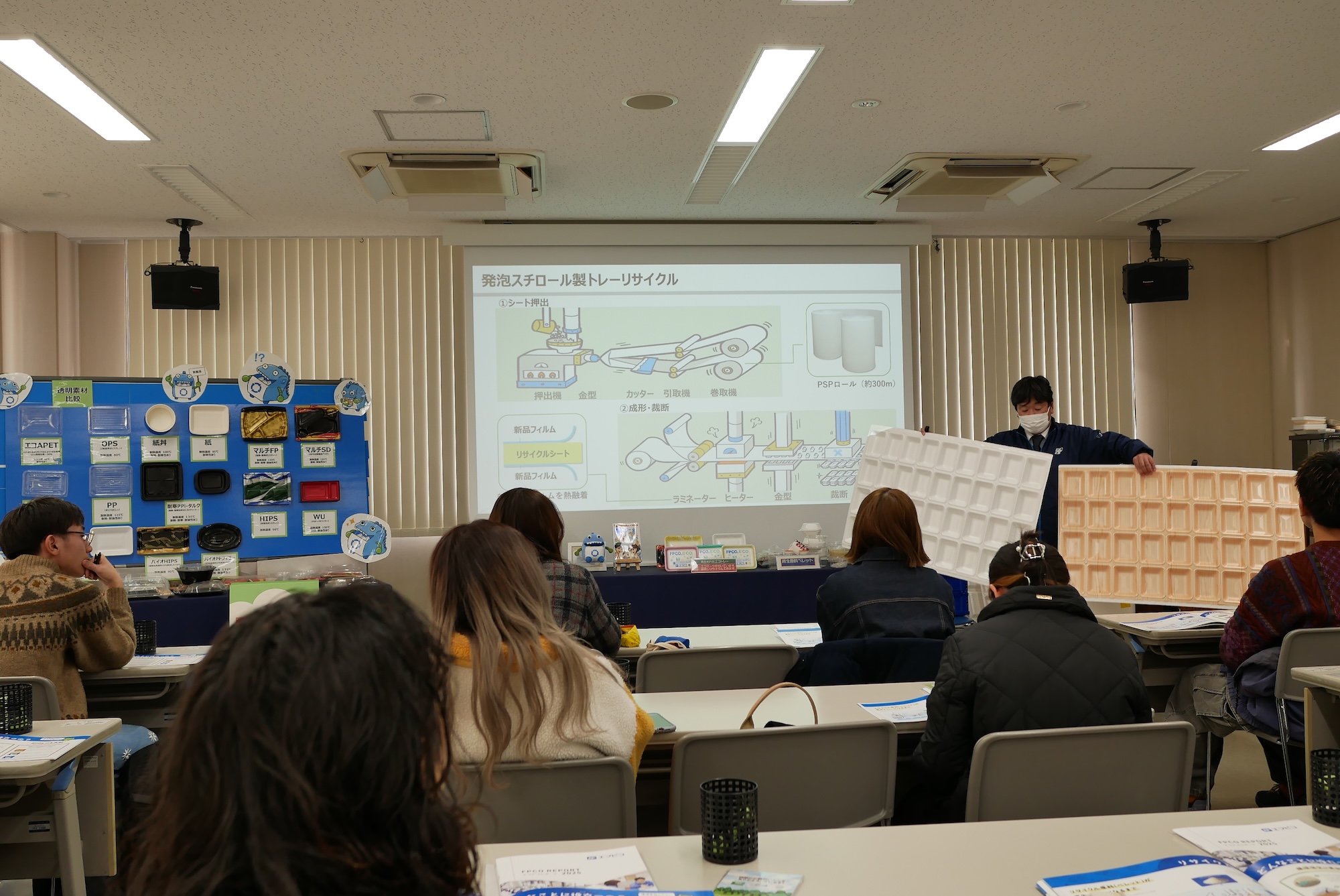 今回の研修は、食品包装容器メーカーの最前線を知ることで、プロダクトデザインにおける素材の循環を実体験として学ぶことを目的としています。学生たちは、全国のスーパーマーケットから回収された使用済みトレーが、わずか40分ほどで再び原料(ポリスチレンペレット)へと再生される「トレー to トレー」のリサイクル工程を真剣な表情で見学しました。