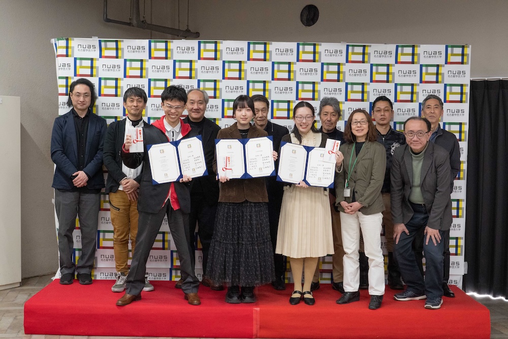 そして、2002年の名古屋学芸大学の開学から2018年の3月まで、メディア造形学部の学部長及びデザイン学科の教授として、さらに2006年からは、大学院メディア造形研究科長を兼任されながら学部の礎を築き、長きに渡り大学の教育現場に従事して来られました。そこで、これまでの功績とご尽力を讃えてご本人の名を冠した「木村一男賞」を創設し、メディア造形学部3学科それぞれに、所属する全学生の創作活動の中から年間で最も優れた作品を木村先生と木村一男賞選考委員会で選び、選考された優秀な学生にこの賞を授与し、その栄誉を讃えつつ、後世にその記録を残し、今後のますますのご活躍を祈念します。