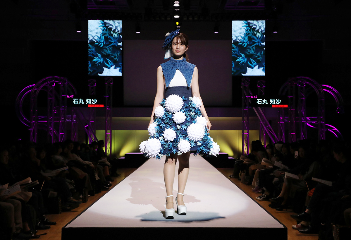 - 地元の伝統技法である有松・鳴海絞りによる平面と立体について研究した。本来使用しない糸を外す前の立体と、糸を外し広げた平面とを組み合わせることで、同じ技法でも全く違う表情となる。古さを連想させる伝統を新しいデザインへと変貌させることができる。