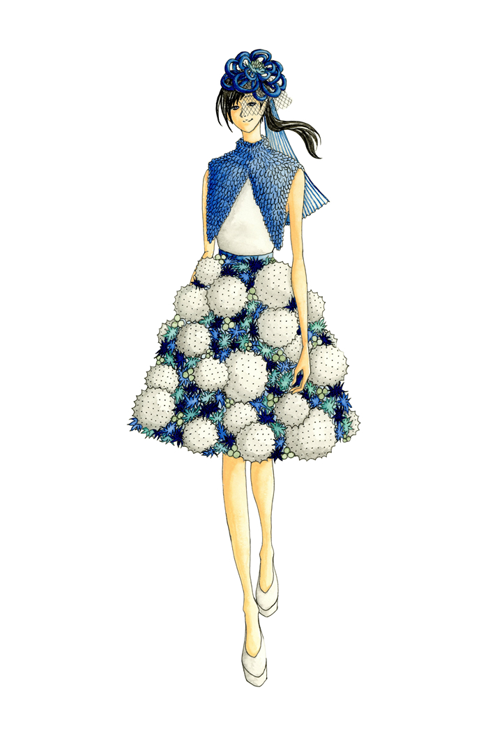 手蜘蛛絞りの絞り糸を外す前の状態のものから生物や植物を連想し、着想を得たデザイン。三浦絞り、手蜘蛛絞り、竜巻絞りの三つの技法を使用し、それぞれの技法の味の違う平面と立体を一つの作品に落とし込んだ。
