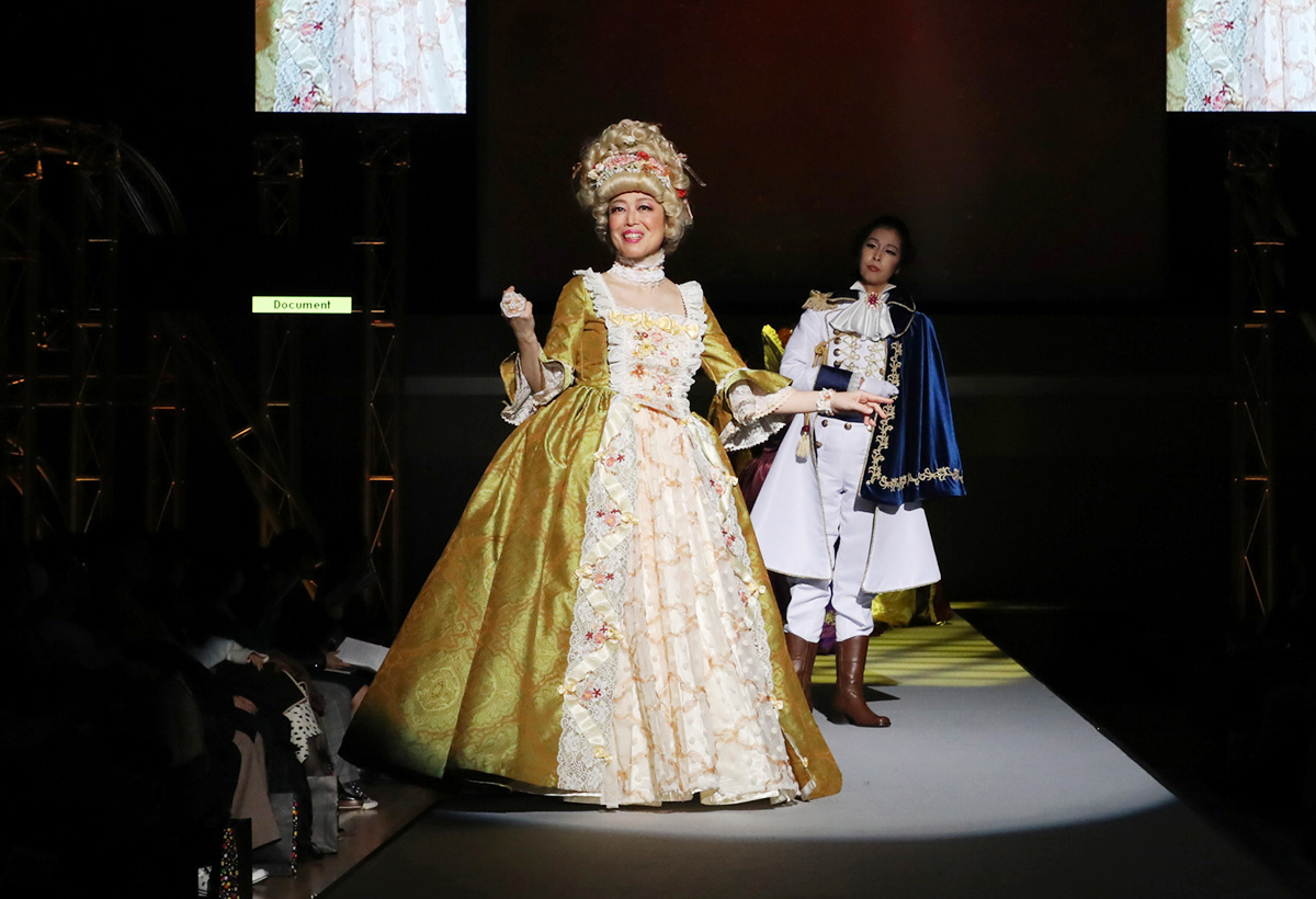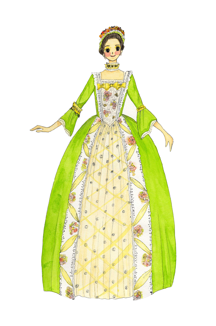 この役どころを研究テーマであるリボン刺繍で表現し、リボン刺繍が栄えた18 世紀のロココスタイルをシルエットに取り入れている。リボン刺繍にもロココスタイルを取り入れつつオリジナルの模様や柄にすることで、自分が一番可愛いと思っている、ぶりっ子な女性を作り上げた。