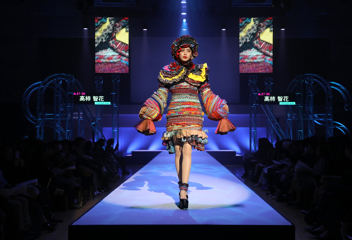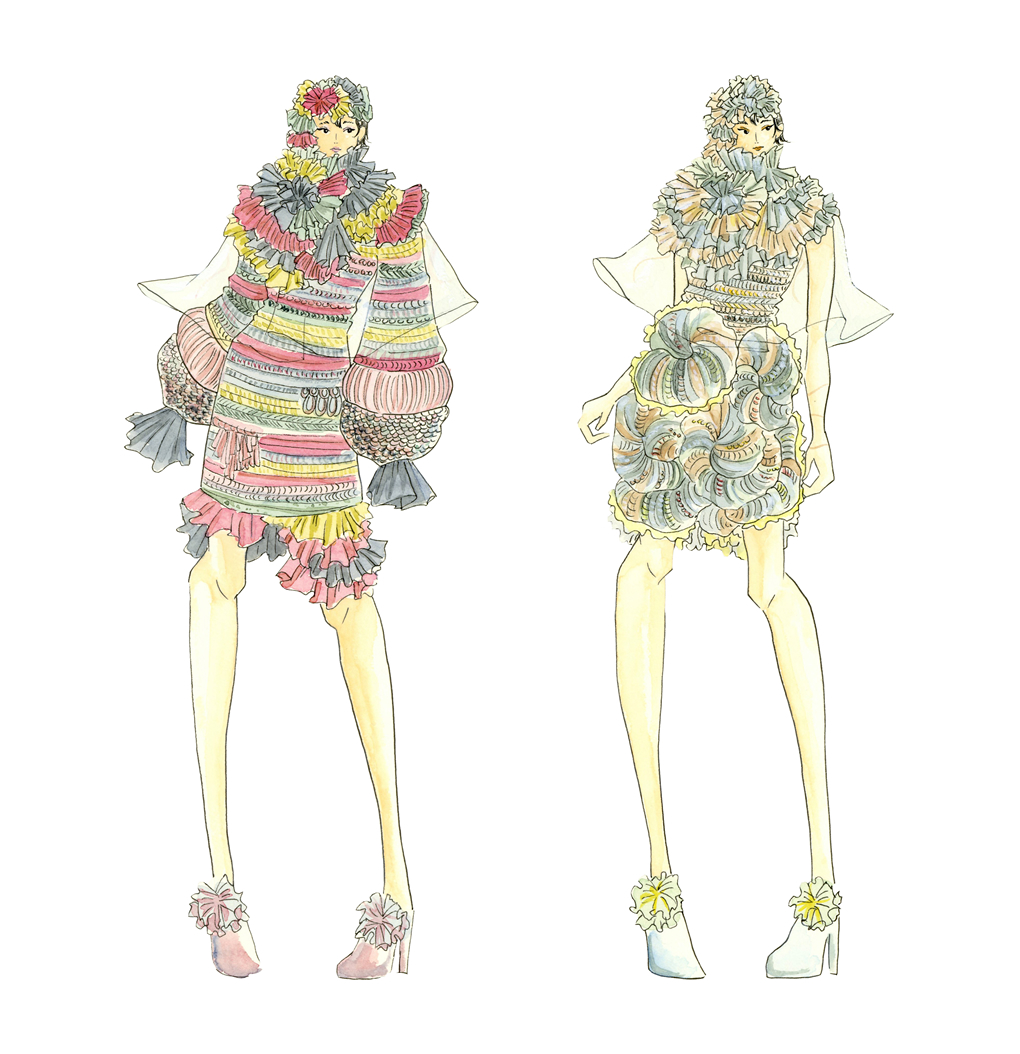 第15回卒業制作 奨励賞 制作者 高柿 智花 海の世界を織・編を使い表現するファッション 海の世界を抽象的に表現する。海を『生』と『死』の2つのイメージに分け、それぞれを色合いと装飾で対比させる。 『生』は様々な色彩を用い、海の生物が泳ぎ回る活気のある鮮やかな海。 『死』はサンゴ礁の白化から白を基調とした色合いを用い、静かな美しさを持つ海。 生き物の質感や色彩は織りや編みの技法を用いて表現した。加えて、ビニール生地を使用することで海の透明感を強調した。 一覧ページへ