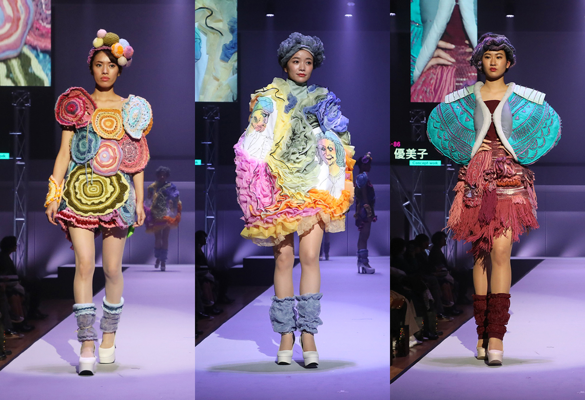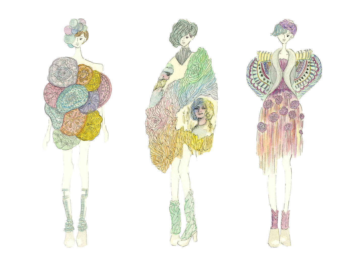 第15回卒業制作 奨励賞 制作者 星 優美子 芸術的側面に特化したファッション アートとは、非実用的で審美性をもった唯一無二の自己表現の世界である。 アートでも様々な分類ができ、視覚芸術分野の建築と絵画に着目した。更に細かく分類をし、ゴシック建築に見られる壁面装飾やガラス細工と、印象派絵画に用いられる色彩を取り入れ、それらを彫刻的・着彩的技法を用いて作品をキャンバスに見立てて表現していく。 作品を通して、似通ったモノがありふれた現代に奇観を呈する。 一覧ページへ