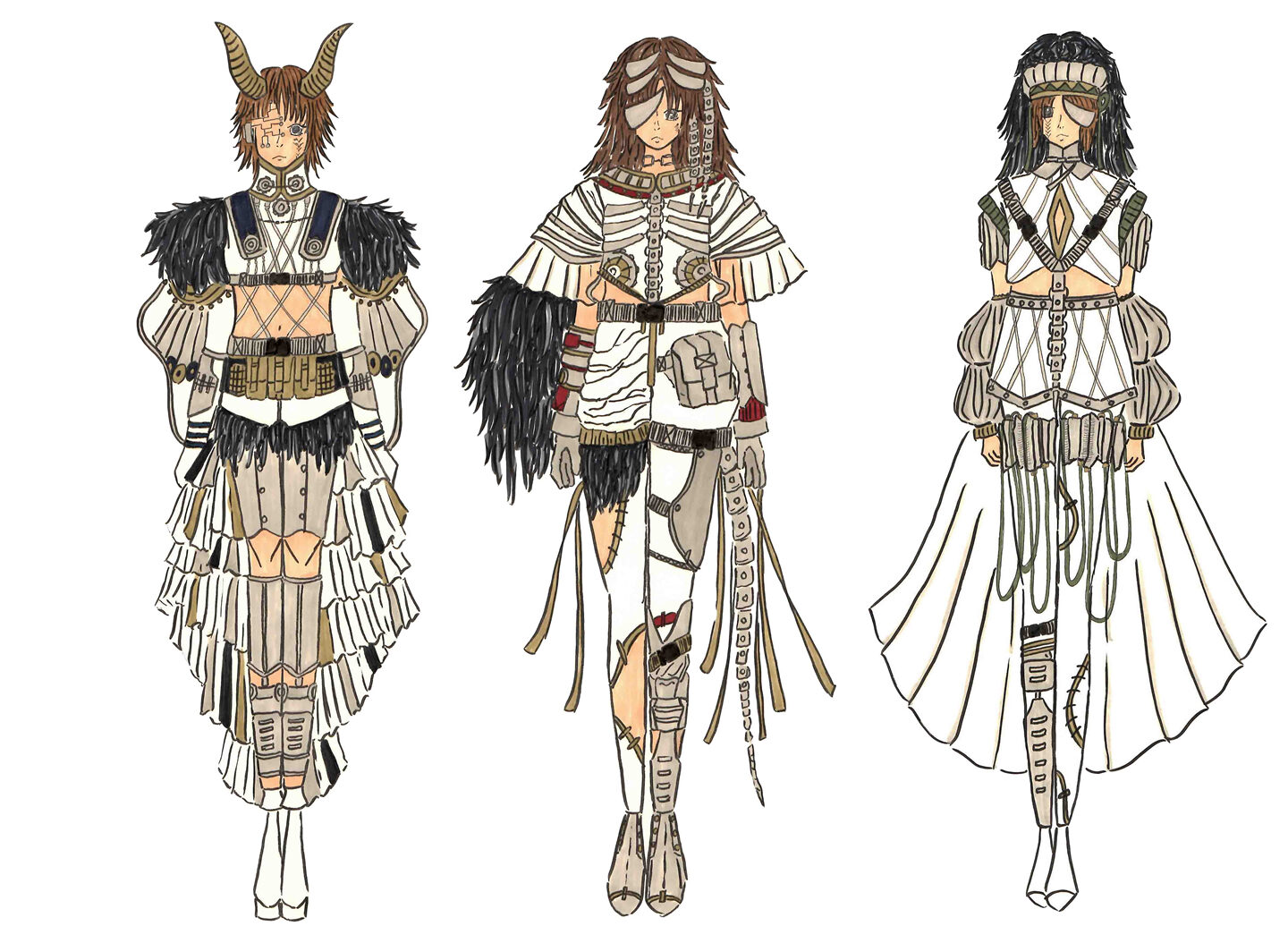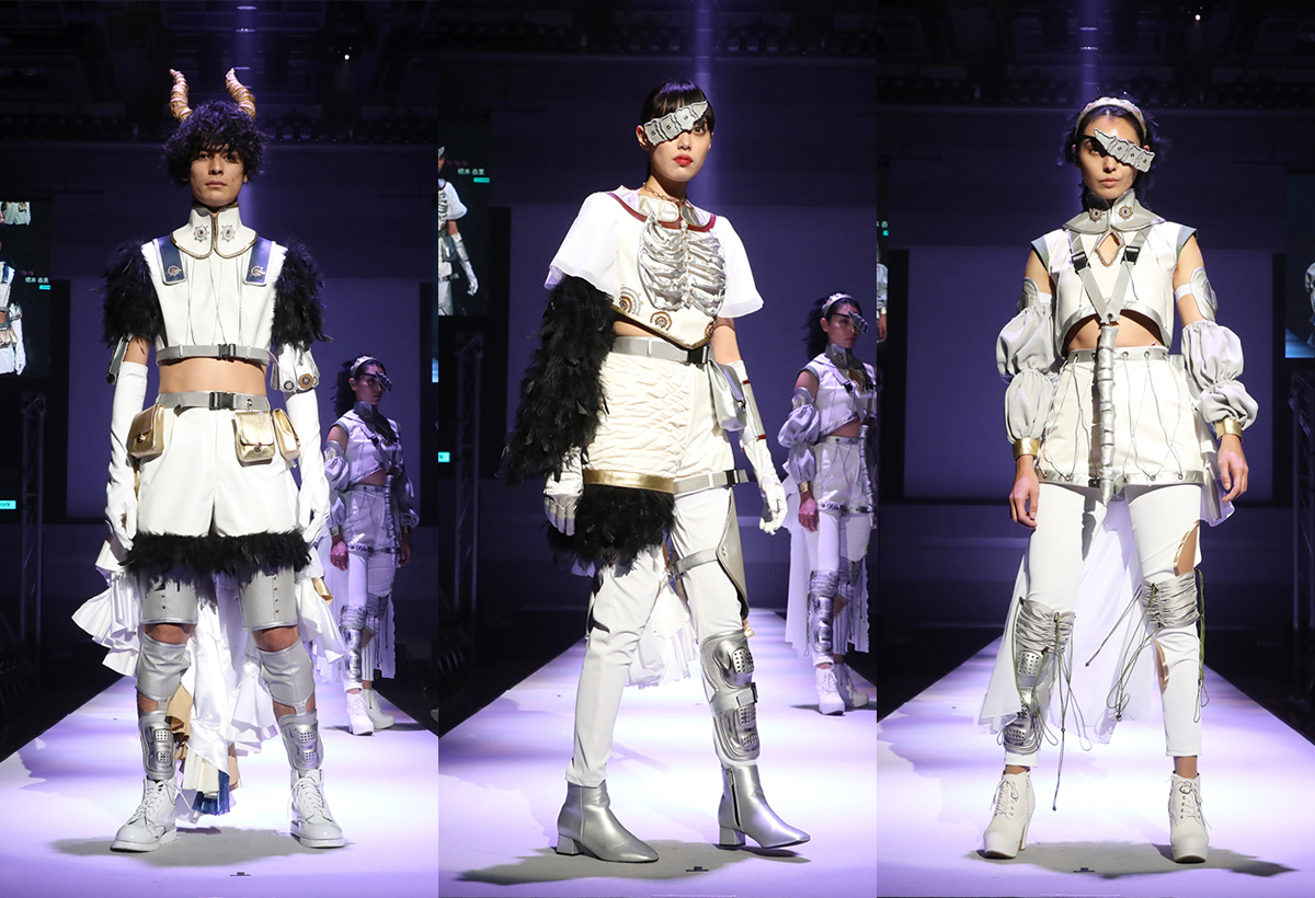 第16回卒業制作 奨励賞 制作者 橋本 恭果 世界観を視覚化するコンサート衣装 本作品のテーマは「獣人たちの戦い」である。 年代・地域・種属の明らかでない獣人をモデルにした戦闘服をデザインした。 特徴は、戦闘服であると同時にコンサート衣装でもある点で、運動性を阻害する可能性のあるプロテクターの配置に工夫し、3体に赤・青・緑のメンバーカラーを施した。 獣人の要素として金属やレザーを使用した角や骨のモチーフを制作し、世界観を表現した。 一覧ページへ