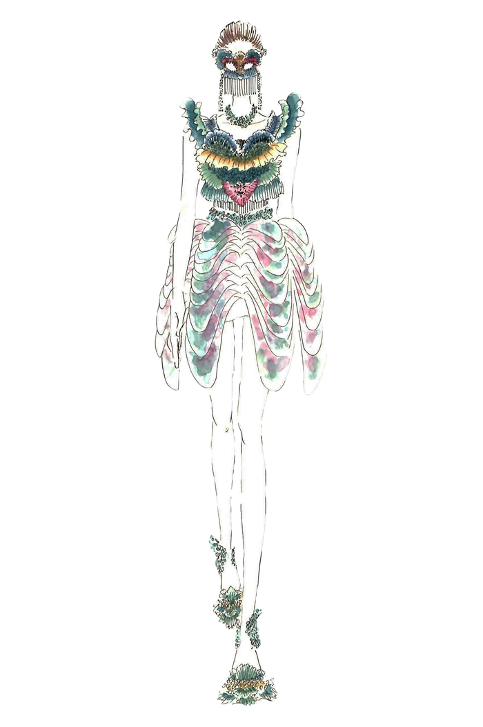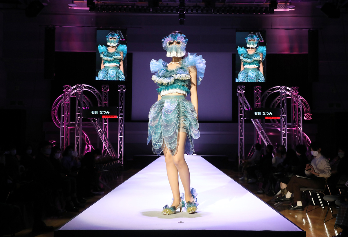 第16回卒業制作 シルバー賞 制作者 石川 なつみ 空気の可視化 生物が生きる上で必要不可欠な空気の存在。目には見えないその存在を今改めて認知することを目的とし、空気を着ることに挑戦。ポリエステル地を染色後、絞り染めの技法でガラス玉を一粒ずつ糸で絞り、生地の熱可塑性を利用して形状記憶をさせた。小さな布の粒と歩くたびに動く布の層、その両方が空気を纏うことで認知が可能になるのではないかと考えた。見えないものと共存する私たちの曖昧さと、空気の繊細さを作品に落とし込んだ。 一覧ページへ