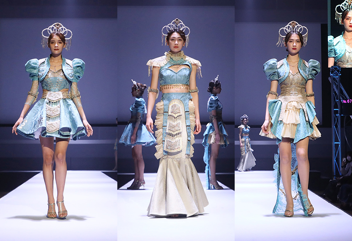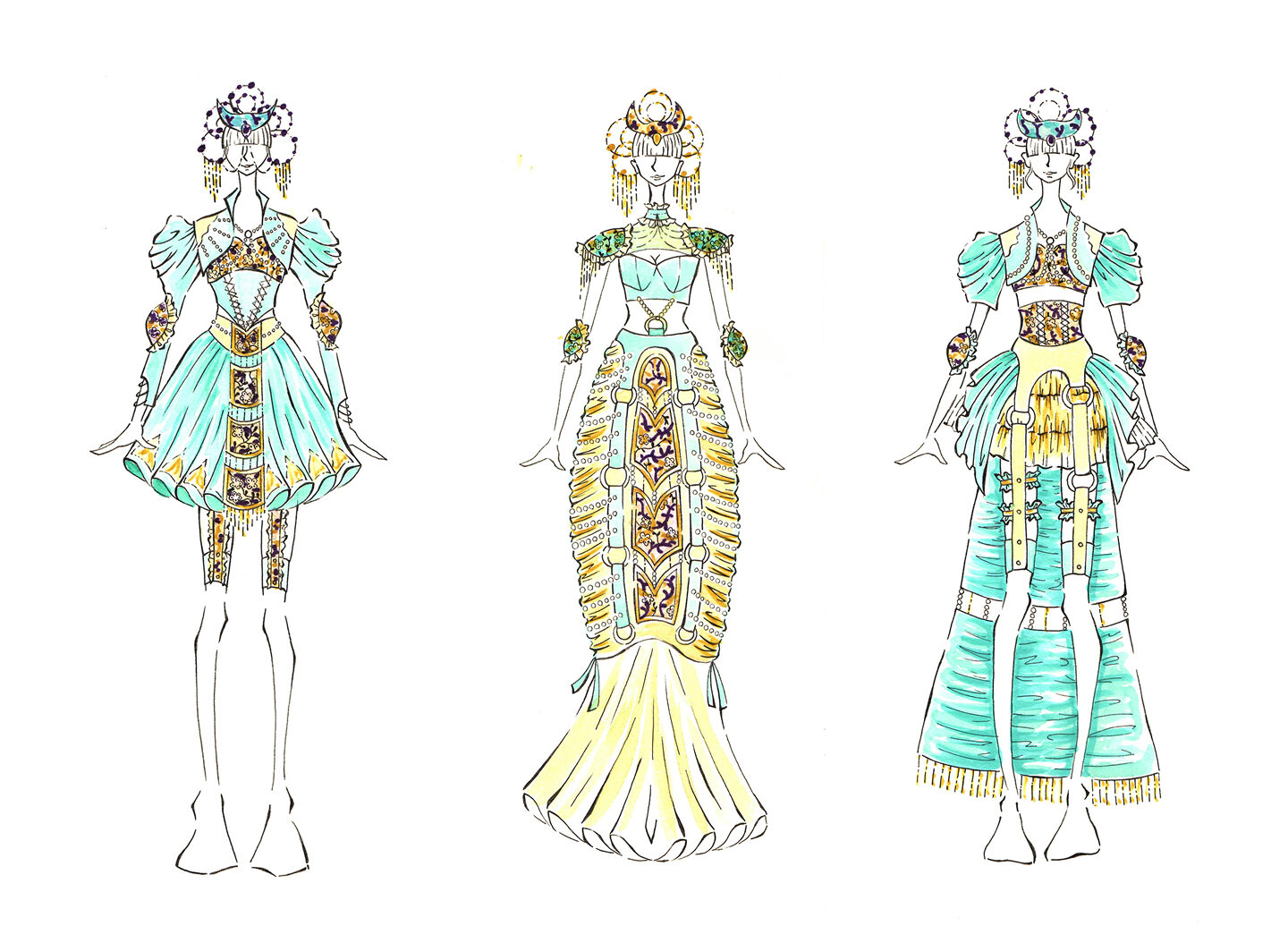 そこで、外敵から身を守る・魔よけなどのアクセサリーとしての本来の機能と、現代において美しさを表すアクセサリーを融合したファッションを提案。プロテクターを現代風アクセサリーに装飾しラグジュアリーに仕上げた。