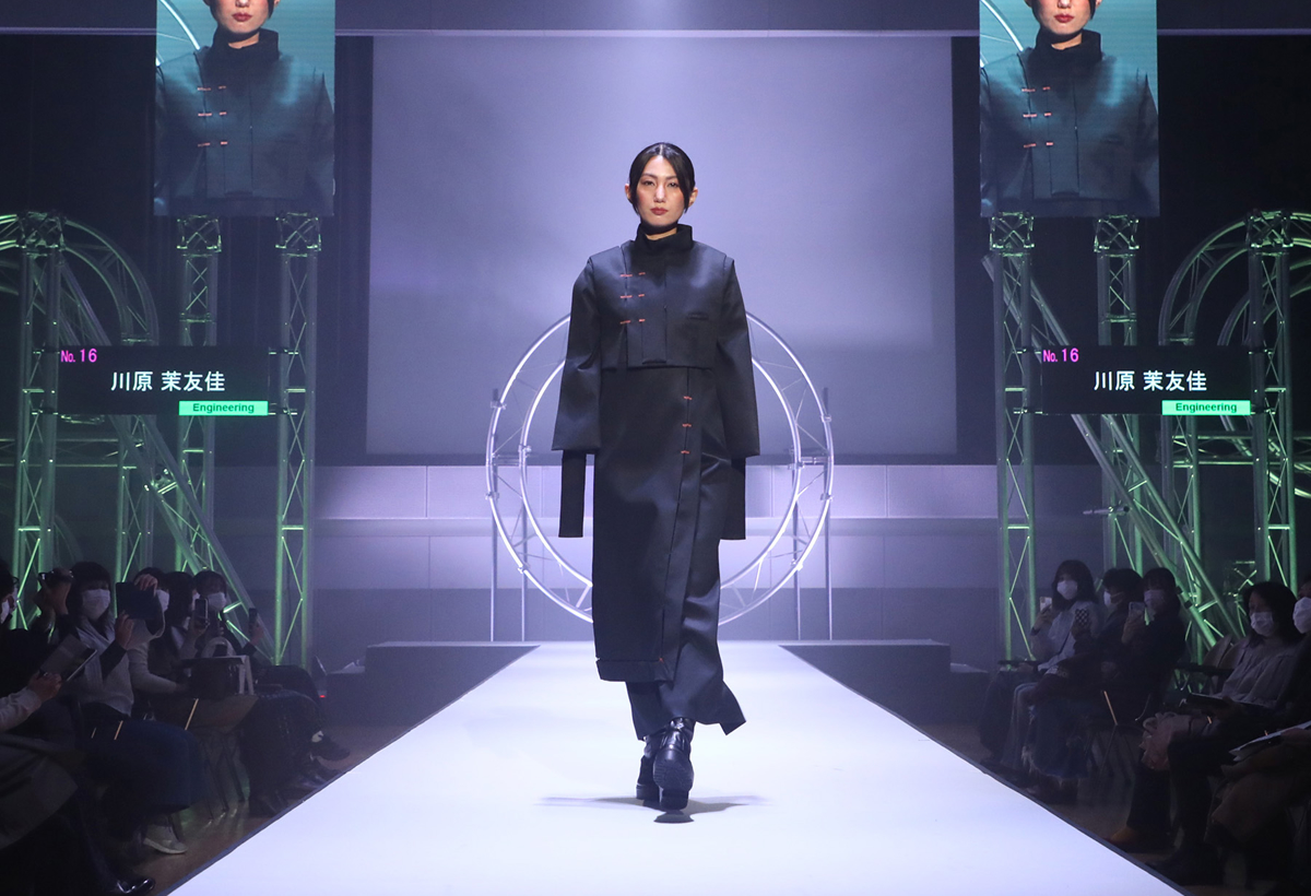 無彩色に限った建物やインテリアの「無機質」で「シンプル」かつ「直線的な影ができる」という3つの魅力ある特質を表現した。シルエットを直線的なストレート型とし、布を重ねることによって影を生むようなディティールを取り入れ、シンプルな印象を与えるデザインとした。テーマからマインドマップを通して連想したジョージ・オーウェルによる小説「1984年」の“影の世界”の世界観を表現した。