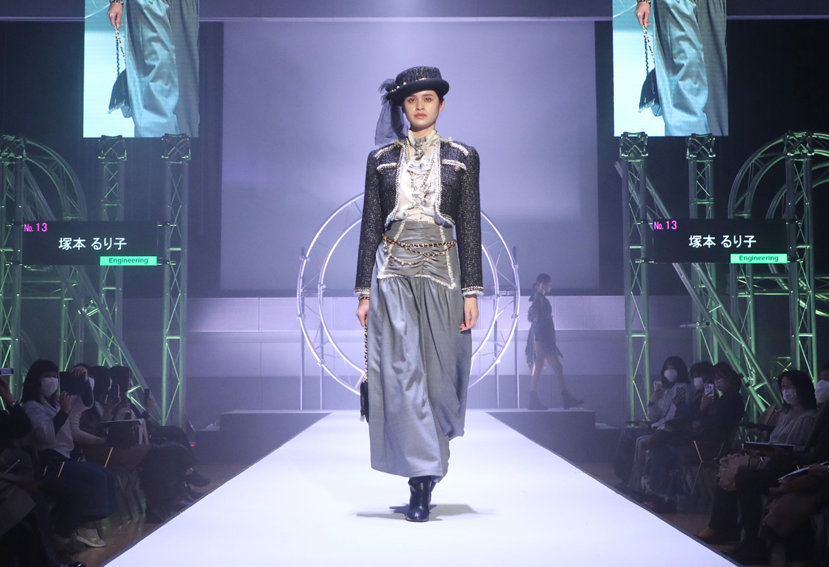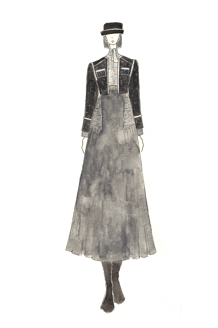 第17回卒業制作 奨励賞 制作者 塚本 るり子 シャネルのスタイルと女性の社会進出 20世紀前半、シャネルが生み出したファッションは世の女性たちを窮屈なドレスから解放し、外見だけでなく内面をも変化させ自立した新たな女性像を確立した。現代においても女性がありのままの姿で活躍できるよう、女性に向けられた理想像や権利について考え直すきっかけになればと思い着想した。シャネルスタイルから得た本来の美しさを引きたたせるフォーマルウェアを提案する。 一覧ページへ